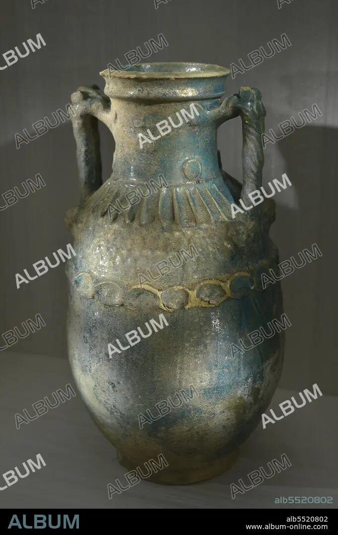 Parthian vase. 1st century BC-1st century AD. Funerary vase decorated with a chain of medallions and four masks depicting the deities of the netherworld. Hellenistic influence. Parthian Empire (247 BC-224 AD). Glazed pottery. Calouste Gulbenkian Museum. Lisbon, Portugal.