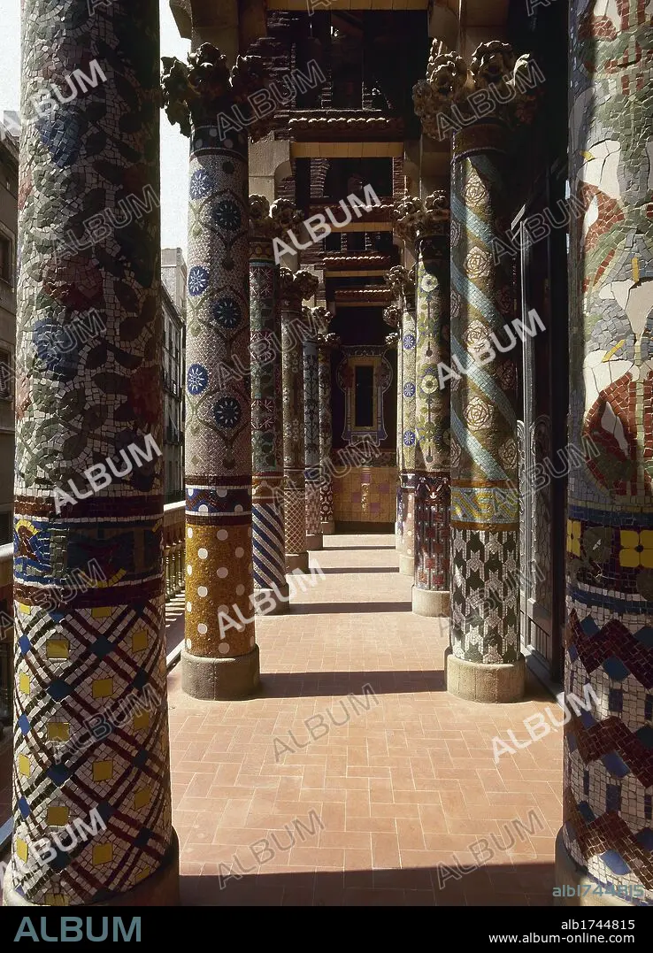 Spain. Barcelona. Palace of Catalan Music. 1905-1908. Modernist style. Built by Lluis Domenech Montaner. Colonnade of the first floor.