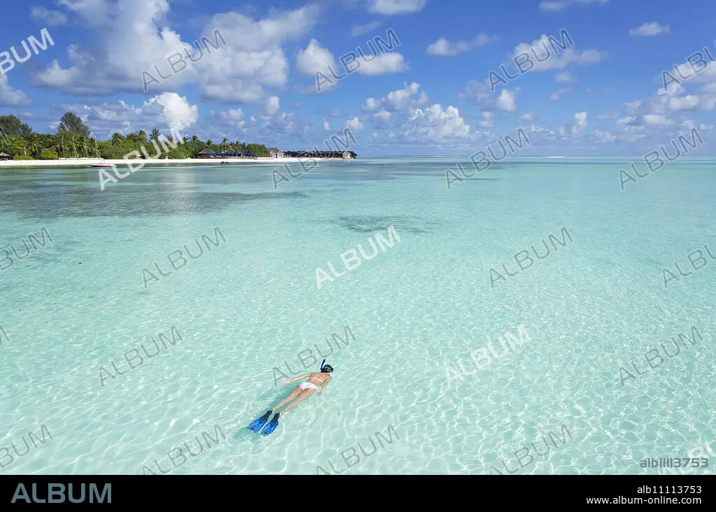 Woman snorkelling at Olhuveli Beach and Spa Resort, South Male Atoll, Kaafu Atoll, Maldives (PR + MR)