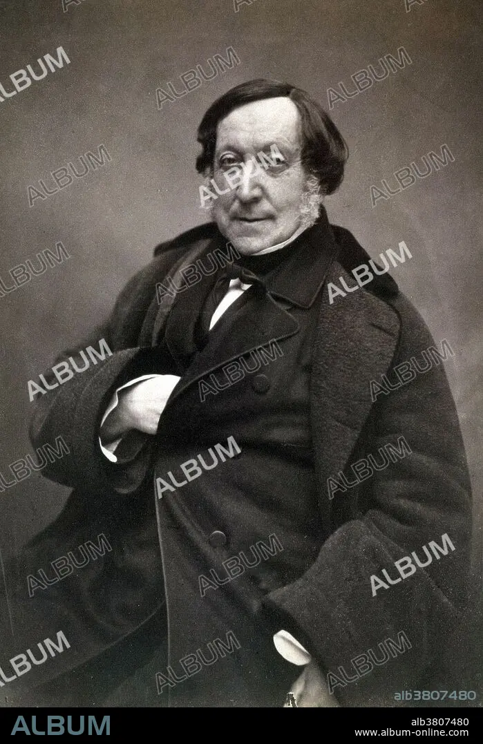 Caption: Rossini photographed by Nadar, March 1856. Gioachino Antonio Rossini (February 29, 1792 - November 13, 1868) was an Italian composer who wrote 39 operas as well as sacred music, chamber music, songs, and some instrumental and piano pieces. He was born into a family of musicians. His father, Giuseppe, was a horn player and inspector of slaughterhouses. His mother, Anna, was a singer and a baker's daughter. According to the Oxford History of Western Music, "Rossini's fame surpassed that of any previous composer, and so, for a long time, did the popularity of his works. Audiences took to his music as if to an intoxicating drug, or, to put it more decorously, to champagne, with which Rossini's bubbly music was constantly compared." Rossini took existing operatic genres and forms and perfected them in his own style. Through his own work, as well as through that of his followers and imitators, his style dominated Italian opera throughout the first half of the 19th Century. He died at the age of 76 from pneumonia in 1868. He was buried in Père Lachaise Cemetery in Paris, France. In 1887, his remains were moved to the Basilica of Santa Croce, Florence, at the request of the Italian government.