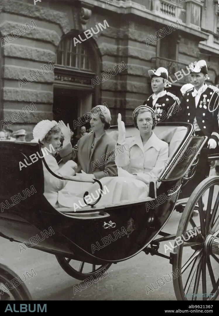 Caption: Princesses Desiree, Margareta and Birgitta of Swden, Stockholm, 1951. Princess Desiree (1938-), Princess Margaretha (1934-) and Princess Birgitta (1937-), the three eldest children of Prince Gustaf Adolf, Duke of Västerbotten and Princess Sibylla of Saxe-Coburg and Gotha, riding in a carriage on Sweden's National Day. From the collection of Svenskt Fotoreportages.