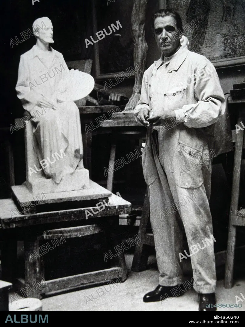 INURRIA, MATEO. ESCULTOR ESPAÑOL CORDOBA 1869-1924. REPRODUCCION FOTO EN SU ESTUDIO DE MADRID ANTE EL BOCETO DEL MONUMENTO AL PINTOR EDUARDO ROSALES