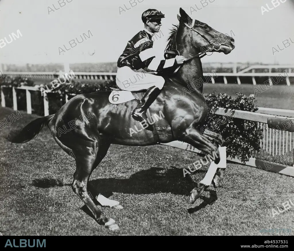 Caption: Photograph - Jim Pike Riding Phar Lap at Derby Day, Flemington Racecourse, Victoria, 1930, Jockey Jim Pike is pictured riding Phar Lap during the Melbourne Cup Carnival. Flemington race track is shown in the background. Pike wears a silk top that has white stripes on the arms. He wears a dark helmet and white jodpurs. Phar Lap's white saddle cloth bears the number 6, which is the number he wore during the Melbourne Stakes, the main race on Derby Day (the first Saturday of the carnival.)