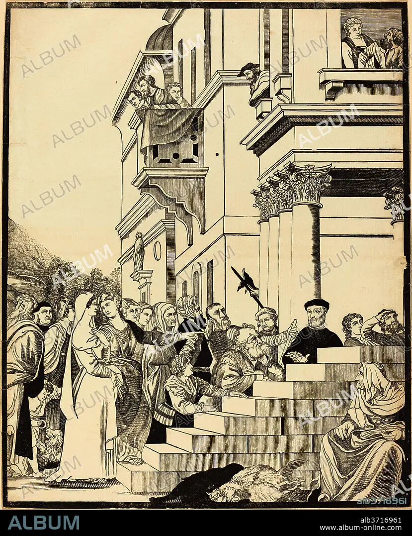 Caption: Presentation of the Virgin in the Temple [center plate]. Dated: 1742. Medium: chiaroscuro woodcut in black [trial proof of key block].