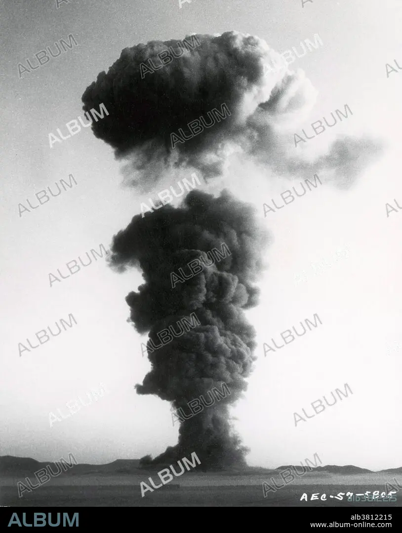 Caption: Stokes test of the LASL XW-30 multi-purpose warhead; used in TADM (tactical atomic demolition munition), and Talos SAM (surface-air-missile) warhead. All oralloy (highly enriched uranium) DT gas-boosted system. Balloon shot was detonated at 1500 feet on August 7, 1957. Operation Plumbbob was a series of nuclear tests conducted between May 28 and October 7, 1957, at the Nevada Test Site. It was the biggest, longest, and most controversial test series in the continental United States. The operation consisted of 29 explosions, of which only two did not produce any nuclear yield. While most Operation Plumbbob tests contributed to the development of warheads for intercontinental and intermediate range missiles, they also tested air defense and anti-submarine warheads with smaller yields. They included 43 military effects tests on civil and military structures, radiation and bio-medical studies, and aircraft structural tests. Operation Plumbbob had the tallest tower tests to date in the U.S. nuclear testing program as well as high-altitude balloon tests. Approximately 18,000 members of the U.S. Air Force, Army, Navy and Marines participated in exercises Desert Rock VII and VIII during Operation Plumbbob. The military was interested in knowing how the average foot-soldier would stand up, physically and psychologically, to the rigors of the tactical nuclear battlefield.