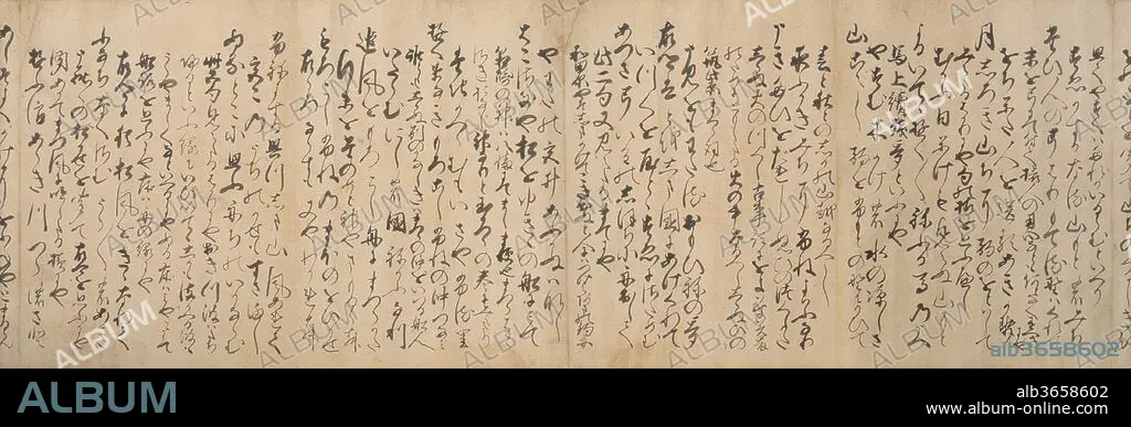 Caption: Manuscript Version of the "Travel" Section of the Linked Verse (Renga) Collection "Aged Leaves" (Wakuraba), compiled by Sogi (1421-1502). Artist: Calligraphy by Ryuko (Japanese, active 16th century). Culture: Japan. Dimensions: Overall: 9 1/16 in. × 10 ft. 15/16 in. (23 × 307.2 cm). Date: 1533.