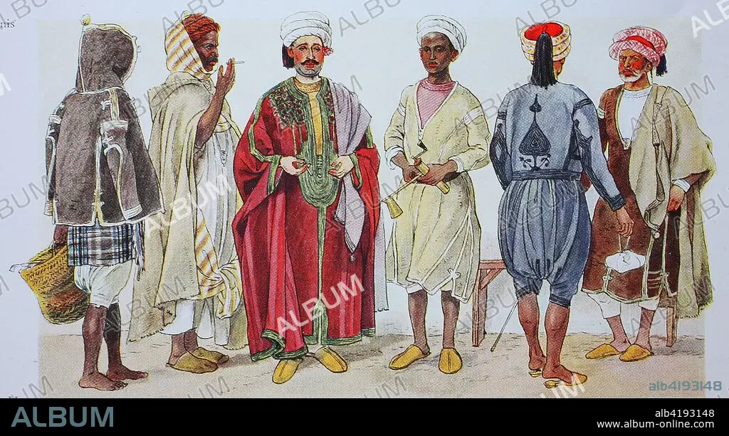 Caption: Clothing, fashion in Tunisia, Tunis, around the 19th century, from the left, a worker in a hooded jacket, a native of the Berber tribe, a wealthy Tunisian from the capital, a coffee merchant, a two Tunisian citizen, digital improved reproduction from an original from the year 1900