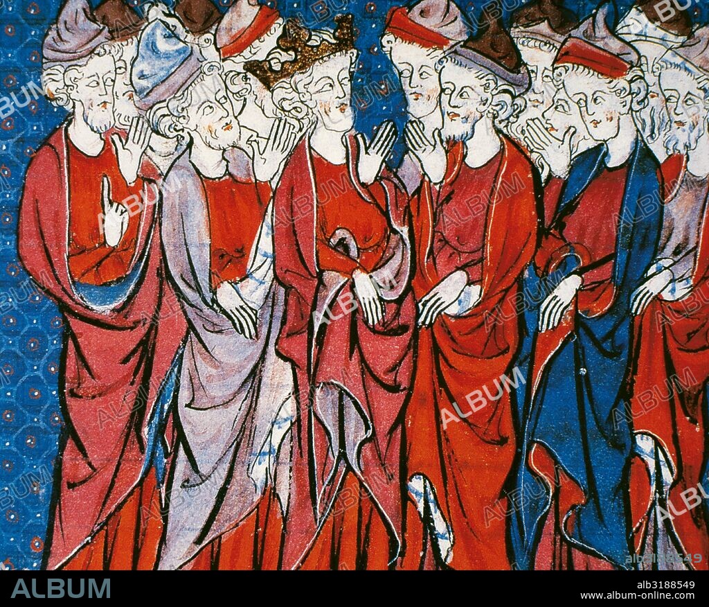 David (1040-970 BC). King of Israel. King David blessing his son Solomon. Miniature of the Bible in French. 15th century. Conde Museum. Chantilly. France.