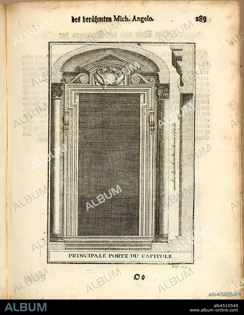 Caption: Main gate of the Capitol, Gate of the Capitol in Rome, tab. 114, p. 289, Augustin-Charles d'Aviler, Vignola, Michelangelo, Leonhard Christoph Sturm, Hertel: Ausführliche Anleitung zu der gantzen Civil-Bau-Kunst [...]. Augspurg: bey Johann Georg Hertel, 1747