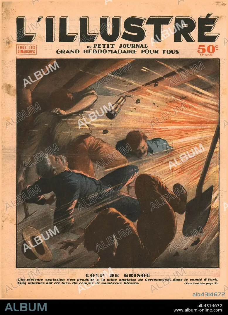 Firedamp explosion, 1932. 'Coup de Grisou'. On 9 December 1932, 7 miners were killed in an explosion at Cortonwood Colliery in South Yorkshire. An 8th man died later. The Cortonwood Pit Disaster was caused by firedamp, a flammable gas. Front cover of "L'Illustré du Petit Journal". [France, 18 December 1932]