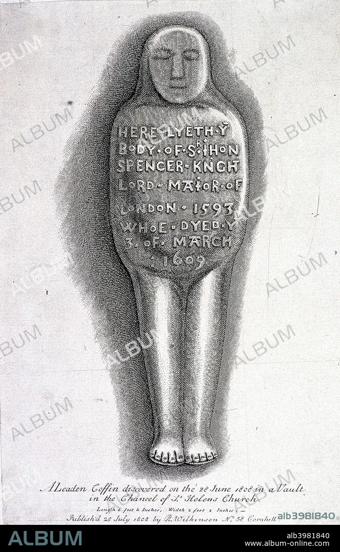 Leaden coffin of Sir John Spencer, Lord Mayor of London 1594-95 in St Helen, Bishopsgate, London, 1808.