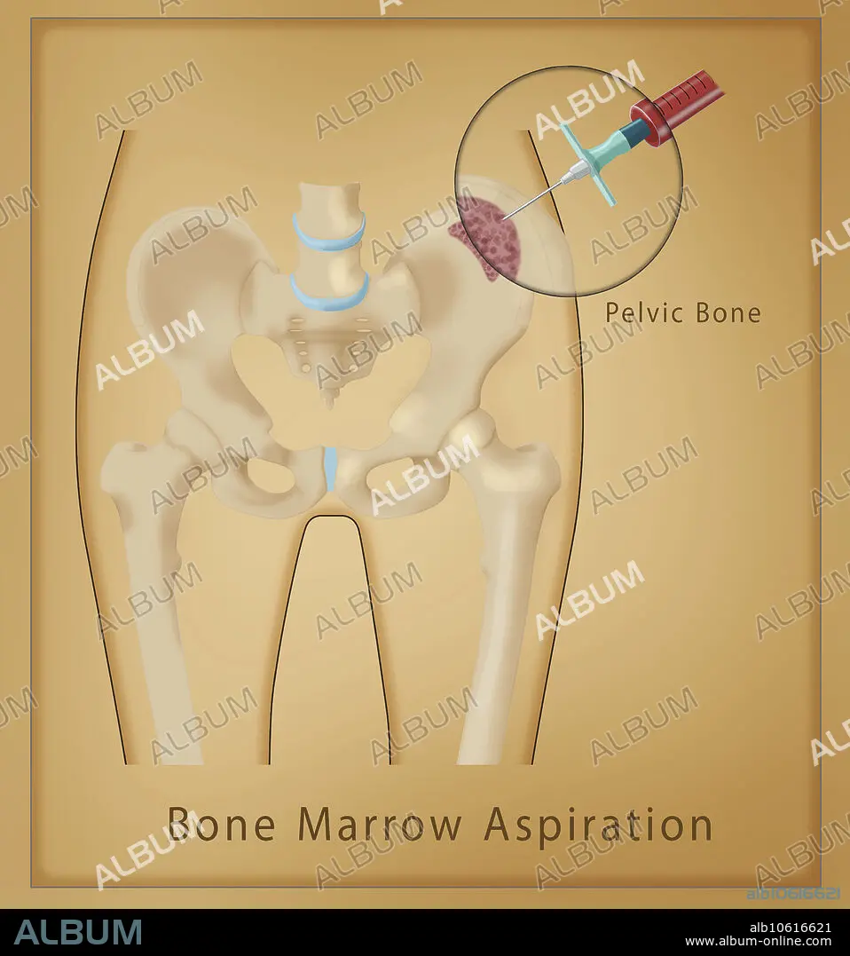 Caption: Illustration of bone marrow aspiration. A thin needle is used to withdraw liquid bone marrow, usually from the hip or the leg. This shows aspiration from the pelvis.
