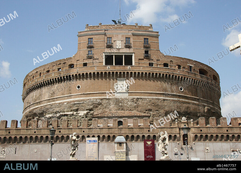 Roman Art. Mausoleum of emperor Hadrian or Castle Sant'Angelo. Built in 139 A.D. and turned into a fortress during the Middle Age. View the Mausoleum with bridge and the river Tiber, decored with angels statue. Rome. Italy. Europe.