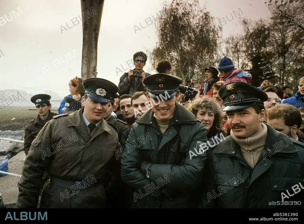 Caption: Fall of the Berlin wall, policemen from West Berlin and a border guard from East Berlin Grenzer at the wall break-through at Potsdamer Platz, Potsdam Square, Berlin, Germany, Europe