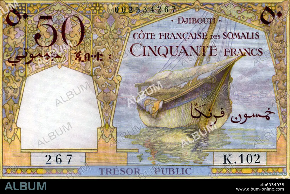 Caption: The obverse shows an Indian Ocean dhow surrounded by Arabesques with 'Fifty Francs' in Arabic and French. To the left the name 'Djibouti' is printed in Arabic and Ethiopian scripts for the Somali Issa and Ethiopian Afar inhabitants.