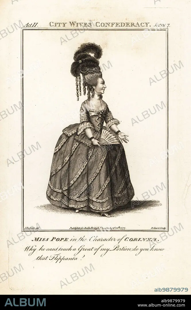 Caption: Miss Jane Pope in the character of Corinna in John Vanbrughs The Confederacy, Drury Lane Theatre, 1759. Pope was an English actress, 1744-1818. Copperplate engraving by R. Pollard after an illustration by James Roberts from Bells British Theatre, Consisting of the most esteemed English Plays, John Bell, London, 1777.