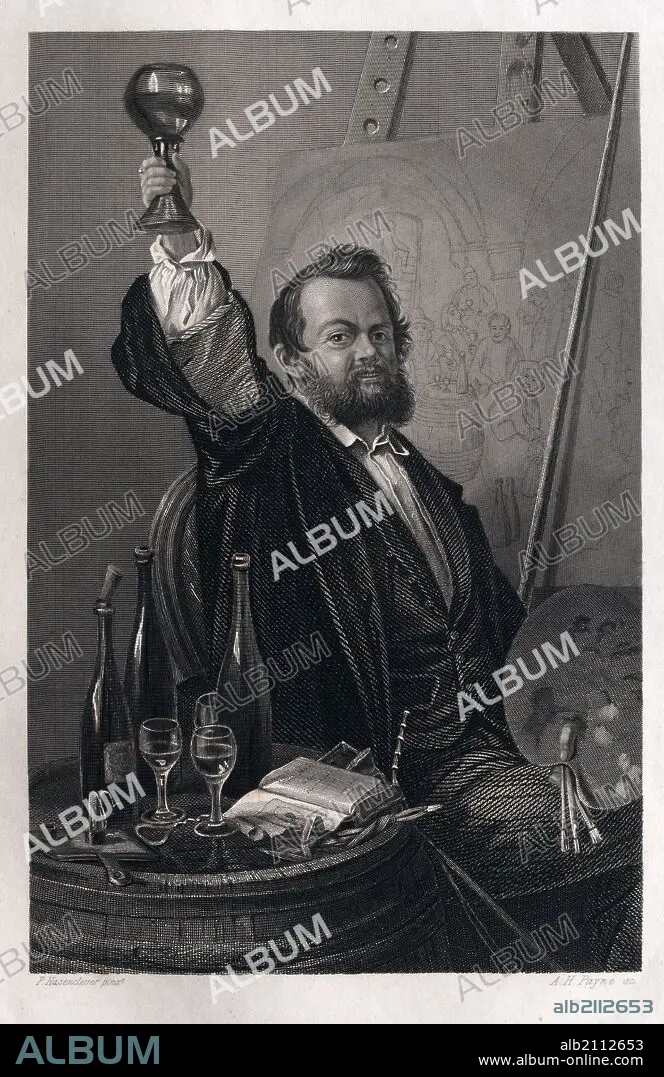 Portrait of the painter Peter Hasenclever, 1810-53, German, known mostly for his genre subjects, food and drink. glass, roemer, painter, palette, painting, table, book, glasses, wineglasses, winebottles, winebottle, candle, beard, cork, drink, alcohol, caucasian, happiness, happy, man, male, 19th century, wine, liszt gourmet archive