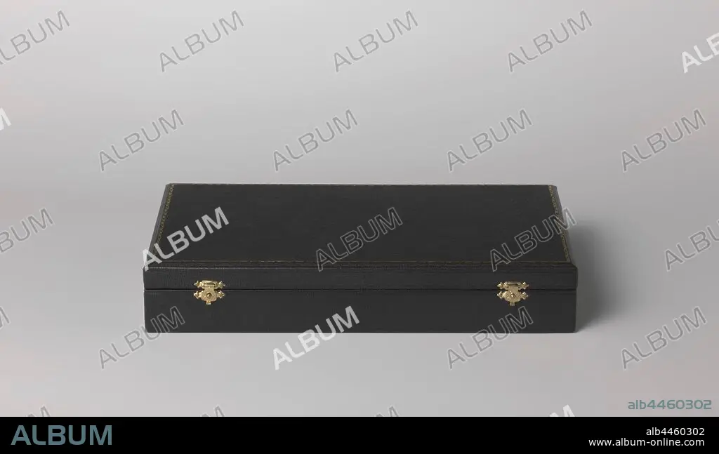 Caption: Box for fork and spoon of black leather and with gold rim on lid. Two clasps, Spoon with fan shaped handle, decorated on the front and back with low-relief bamboo tendrils and on the front, between these tendrils, with an oval medallion with a W. Marked KHC., c. 1900 - c. 2000, wood (plant material), leather, l 28 cm × d 16 cm × h 5 cm