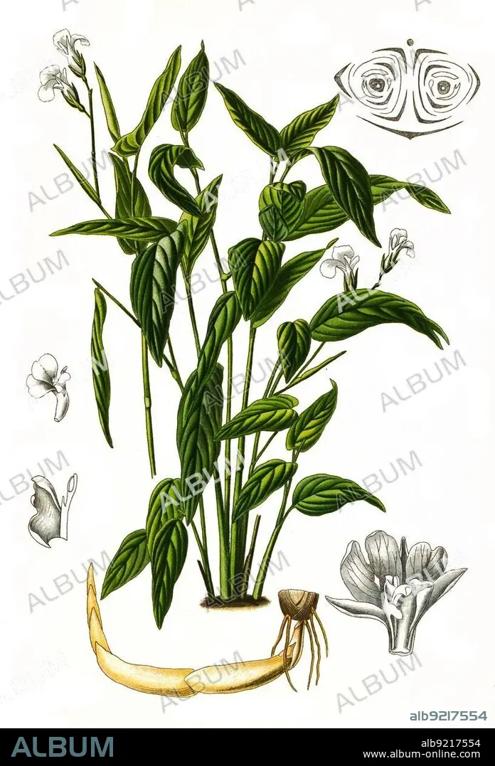 Caption: Maranta arundinacea is a useful plant. It is used to produce the so-called arrowroot flour, Arrowroot, Historical, digitally restored reproduction from an 18th century original