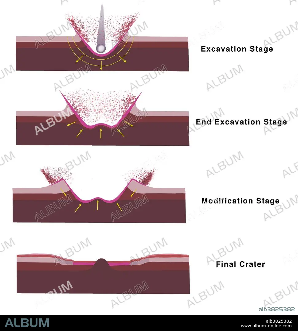 Caption: Illustration of the sequence of events as an impact crater forms. At top (excavation stage), the impactor (bolide), such as an asteroid, hits the surface, losing a lot of its kinetic energy. This lost kinetic energy heats and vaporizes the bolide and the rocks at the surface (end excavation stage) Some of the kinetic energy is dissipated as sound and light, and some is transferred to the surface, deforming it and throwing rock upwards and outwards (modification stage) as the blast wave widens the crater and forms the crater walls. The blast ejecta forms a blanket around the crater, with the rock layers (strata) reversed. This strata reversal is shown in the diagram at bottom (final crater), where the energy of impact has dissipated and the ground at the point of impact has rebounded, leaving a central peak.