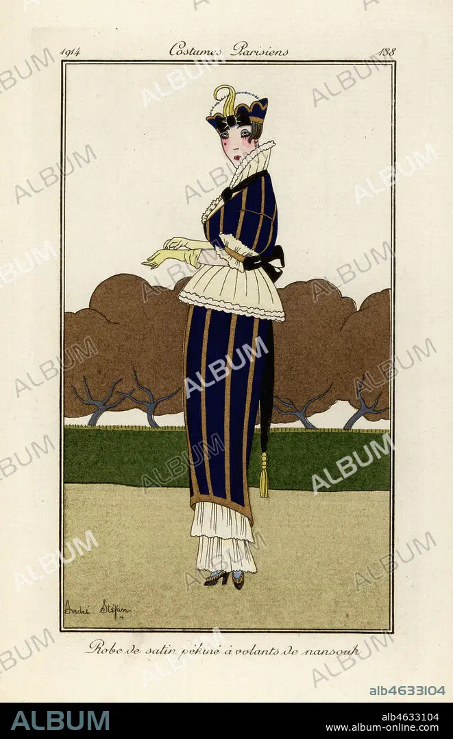 Caption: Woman in blue and yellow striped pekin silk satin dress with nainsook cotton frills. Robe de satin pekine a volants de nansouk. Handcoloured pochoir (stencil) etching after an illustration by Andre Stefan from Tommaso Antonginis Journal des Dames et des Modes, Aux Bureaux du Journal des Dames, Paris, 1912.