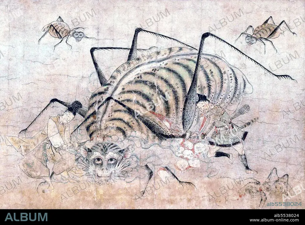 Caption: Tsuchigumo are monstrous creatures with the body of a tiger, limbs of a spider, and the face of a demon. They capture, bind and eat unwary travelers. When Minamoto no Yorimitsu killed a Tsuchigumo, 1,990 human skulls fell out of its belly. The Tsuchigumo no Zoshi Emaki (Narrative picture scroll of the story of the earth spider is a picture scroll depicting a story of a battle between Tsuchigumo and Minamoto no Yorimitsu, a general in the mid-Heian period. The story is well known as an episode in Taiheiki (a warrior tale) and the Noh song 'Tsuchigumo'.