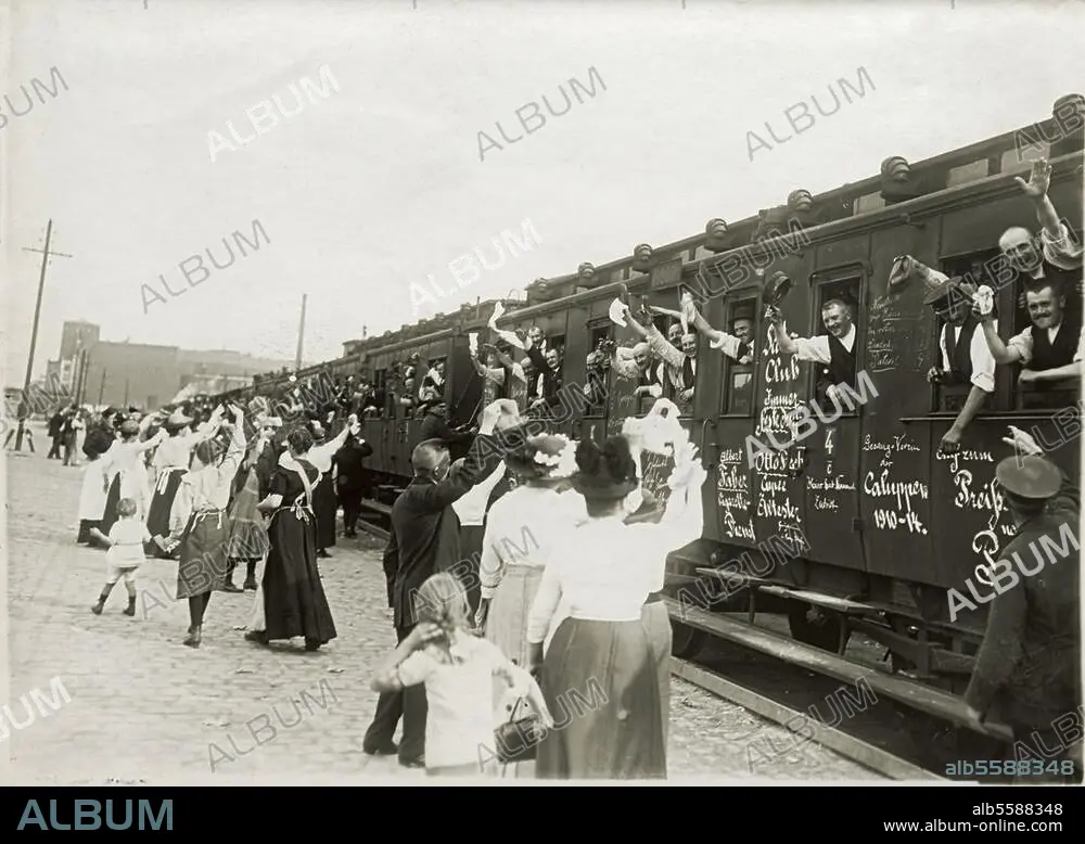 World War I, 1914-18 / Berlin. Departure of a troop transport train from a Berlin station. Photo (Otto Haeckel), 28 August 1918.