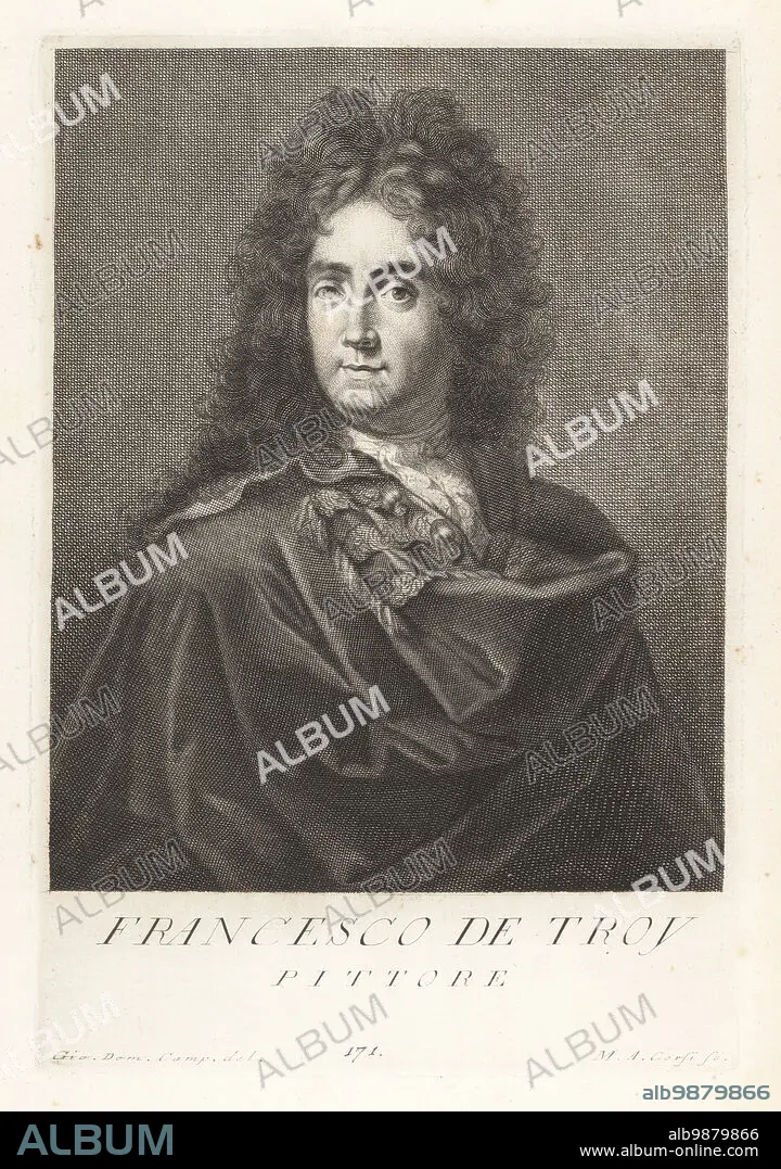 Caption: Francois de Troy, French painter and engraver, 1645-1730. Principal painter to King James II in exile and Director of the Académie Royale de peinture et de sculpture. Francesco de Troy, Pittore. Copperplate engraving by Marcantonio Corsi after Giovanni Domenico Campiglia after a self portrait by the artist from Francesco Moucke's Museo Florentino (Museum Florentinum), Serie di Ritratti de Pittori (Series of Portraits of Painters) stamperia Mouckiana, Florence, 1752-62.