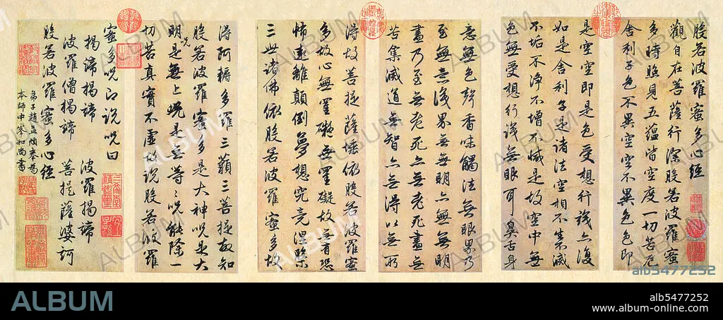 Caption: The Heart Sutra is a member of the Perfection of Wisdom (Prajnaparamita) class of Mahayana Buddhist literature, and along with the Diamond Sutra, is the most prominent representative of the genre. The Essence of Wisdom Sutra (Heart Sutra) is much shorter than the other Perfection of Wisdom sutras but it contains explicitly or implicitly the entire meaning of the longer Sutras. This sutra is classified by Edward Conze as belonging to the third of four periods in the development of the Perfection of Wisdom canon. Conze estimates the sutra's date of origin to be 350 CE. Recent scholarship is unable to verify any date earlier than the 7th century CE. The Chinese version is frequently chanted by the Chan (Zen/Seon/Thien) sects during ceremonies in China, Japan, Korea, and Vietnam respectively. It is also significant to the Shingon Buddhist school in Japan, whose founder Kukai wrote a commentary on it, and to the various Tibetan Buddhist schools, where it is studied extensively.