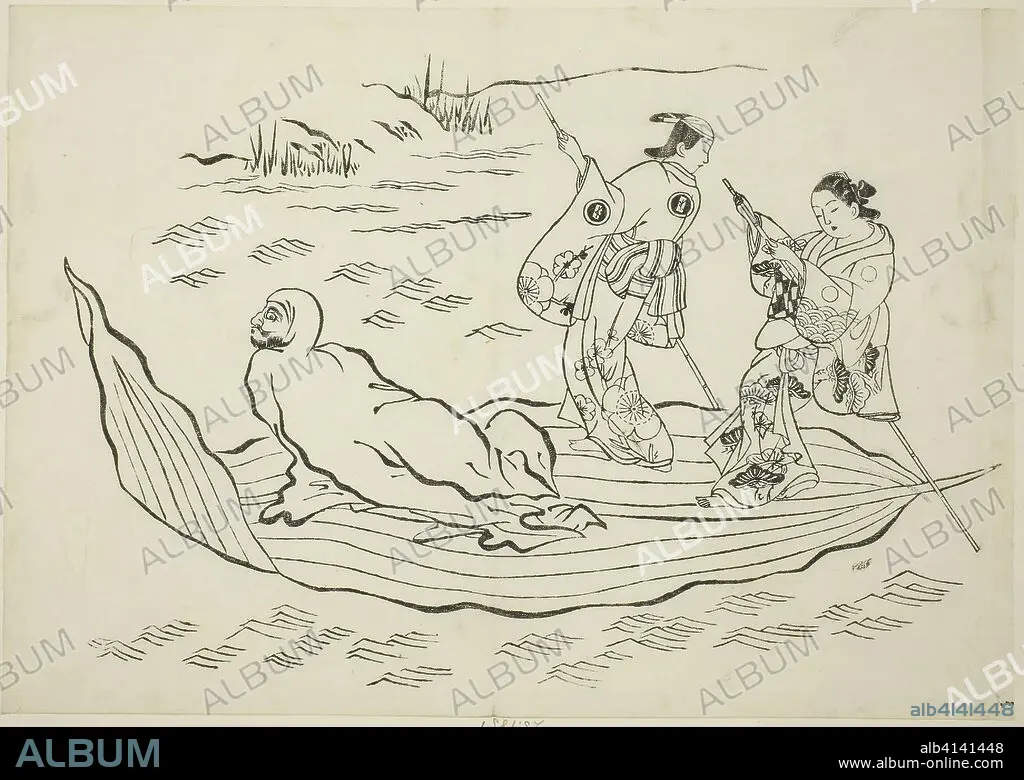 Caption: Daruma crossing the sea on a leaf, no. 7 from a series of 12 prints. Okumura Masanobu; Japanese, 1686-1764. Date: 1703-1713. Dimensions: 26.7 x 38.1 cm. Woodblock print; oban, sumizuri-e. Origin: Japan.