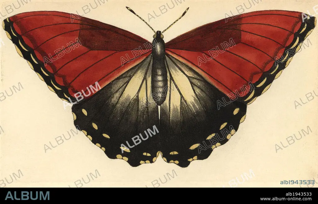 Caption: Sunset morpho butterfly, Morpho hecuba. Illustration unsigned (George Shaw and Frederick Nodder).. Handcolored copperplate engraving from George Shaw and Frederick Nodder's "The Naturalist's Miscellany" 1794.. Frederick Polydore Nodder (1751~1801?) was a gifted natural history artist and engraver. Nodder honed his draftsmanship working on Captain Cook and Joseph Banks' Florilegium and engraving Sydney Parkinson's sketches of Australian plants. He was made "botanic painter to her majesty" Queen Charlotte in 1785. Nodder also drew the botanical studies in Thomas Martyn's Flora Rustica (1792) and 38 Plates (1799). Most of the 1,064 illustrations of animals, birds, insects, crustaceans, fishes, marine life and microscopic creatures for the Naturalist's Miscellany were drawn, engraved and published by Frederick Nodder's family. Frederick himself drew and engraved many of the copperplates until his death. His wife Elizabeth is credited as publisher on the volumes after 1801. Their son Richard Polydore (1774~1823) exhibited at the Royal Academy and became botanic painter to King George III.