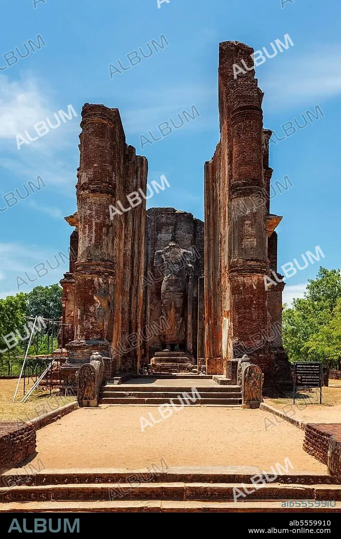 Caption: Ruins of Lankatilaka Vihara, temple with Buddha image, Ancient city of Pollonaruwa, famous tourist attraction and archaelogical site, Sri Lanka, Asia