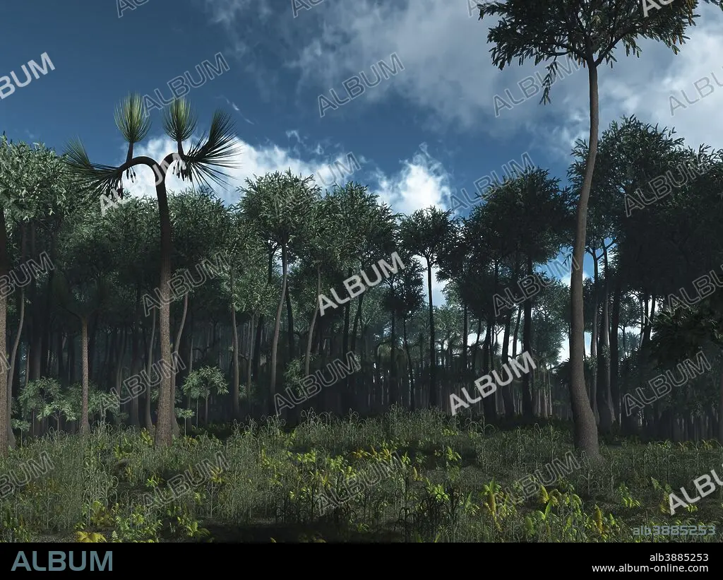 Title: A Carboniferous forest of Midwestern North America 350 million years ago.