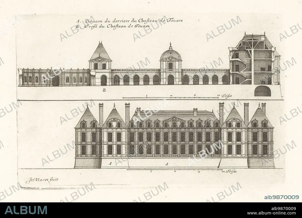 Caption: The Chateau des Ducs de La Tremoille, or Castle of the Dukes of La Tremoille. Elevation of the back of the castle A, and profile B. Elevation du derriere du Chasteau de Touars. Profil du Chasteau de Touars. Copperplate engraving drawn and engraved by Jean Marot from his Recueil des Plans, Profils et Elevations de Plusieurs Palais, Chasteaux, Eglises, Sepultures, Grotes et Hotels, Collection of Plans, Profiles and Elevations of Palaces, Castles, Churches, Tombs, Grottos and Hotels, chez Mariette, Paris, 1655.