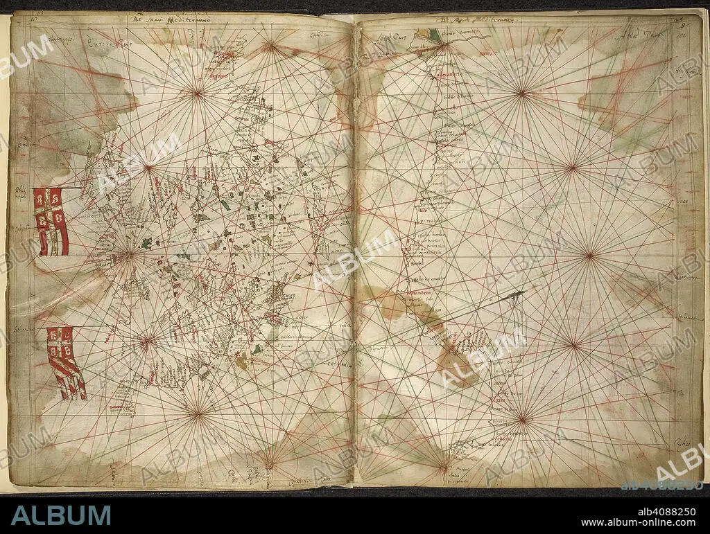 Caption: Portolan chart of the Eastern Mediterranean, with Greece, Turkey, the Black Sea, and Crete. Maps of the Liber Secretorum Fidelium Crucis. Italy (Venice); circa 1320-1325. Source: Add. 27376*, ff.183v-184. Language: Latin.