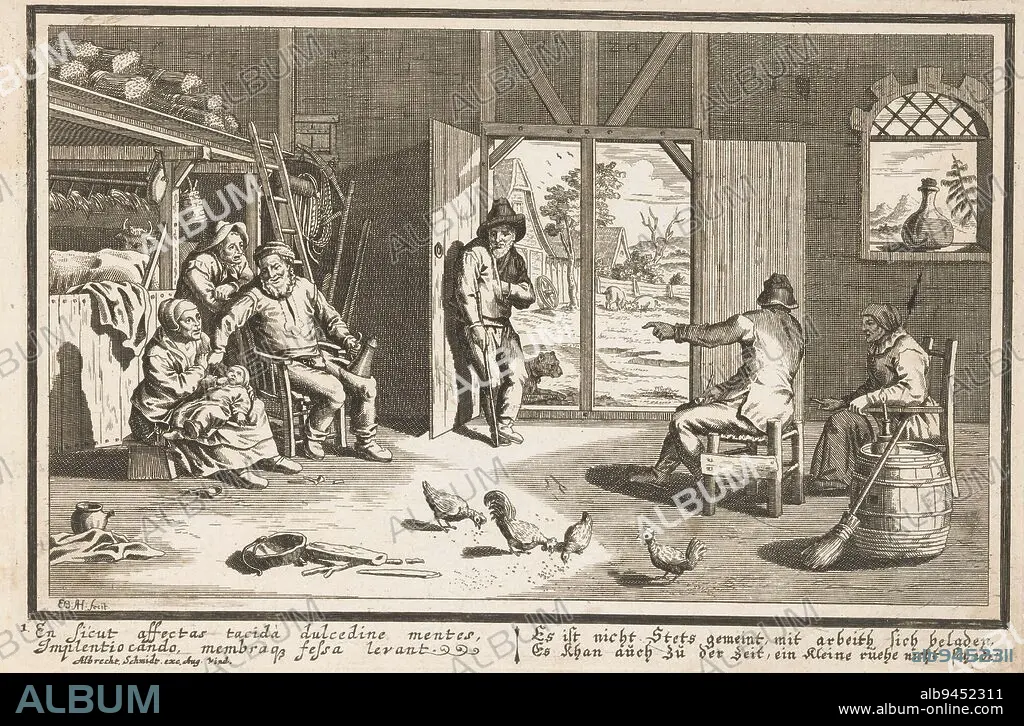 Caption: With caption in Latin and German, Interior of a farmhouse, print maker: Elias Baeck, (mentioned on object), publisher: Albrecht Schmidt, (mentioned on object), print maker: Germany, publisher: Augsburg, 1694 - 1744, paper, etching, h 192 mm × w 290 mm