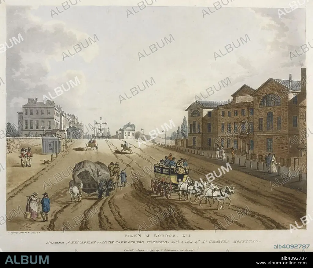 Caption: Views of London. No.1. Entrance of Piccadilly or Hyde Park Corner Turnpike, with a view of St. Georges Hospital. View on a London street, with carriages and carts on the street, a turnpike gate in the distance, buildings on the right and in the distance on the left; in foreground is depicted Collier's Southampton Coach on eight wheels, pulled by four white horses. . Views of London. Publish'd by R Ackermann 101 Strand August 1 1797. 1 print : hand coloured etching and aquatint ; 360 x 455 mm. Source: Maps.K.Top.22.6.a.