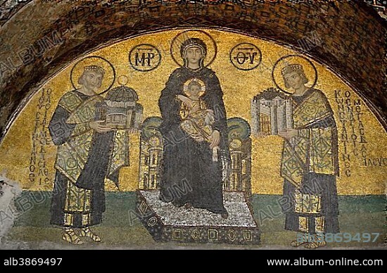 Virgin Mary with the baby Jesus between Emperor Constantine with a model of his new city of Constantinople and Justinian with the model of his new church, Byzantine Deesis mosaic above the main portal, Hagia Sophia, Ayasofya, UNESCO World Cultural Heritage Site, Istanbul, Istanbul Province, Turkey, Asia