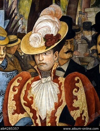 Caption: Diego Rivera. Mexican school . Diego's Dream or Dream of a Sunday Afternoon in Alameda Central (Sueno de una tarde dominical en la almeda central). Detail: Carmen Romero Rubio de Diaz, second wife Porfirio Diaz.. Fresco (4 x 15 m.). Museo Mural Diego Rivera, Mexico . Diego Rivera (Guanajuato, 1886 - San Angel, 1957).. Porfirio Diaz (1830-1915), Mexican politician and serviceman.. Carmen Romero Rubio de Diaz (1864-1944).. . The fresco decorated the main hall of the former Hotel de Prado, situated near the town's main park.. These photographic works are protected by legislation concerning literary and artistic property in all countries. Royalties are handled by ADAGP. To publish or diffuse these photographs, you must imperatively obtain the authorization of ADAGP or its correspondents abroad and to pay corresponding royalties. If you download this image in high definition, your postal address, telephone number and e-mail address will automatically be forwarded to ADAGP.. ADAGP - 11,rue Berryer - Paris. Tel. : (33) 1 43 59 09 79. Fax : (33) 1 45 63 44 89. E-mail : adagp@adagp.fr. Web : http://www.adagp.fr