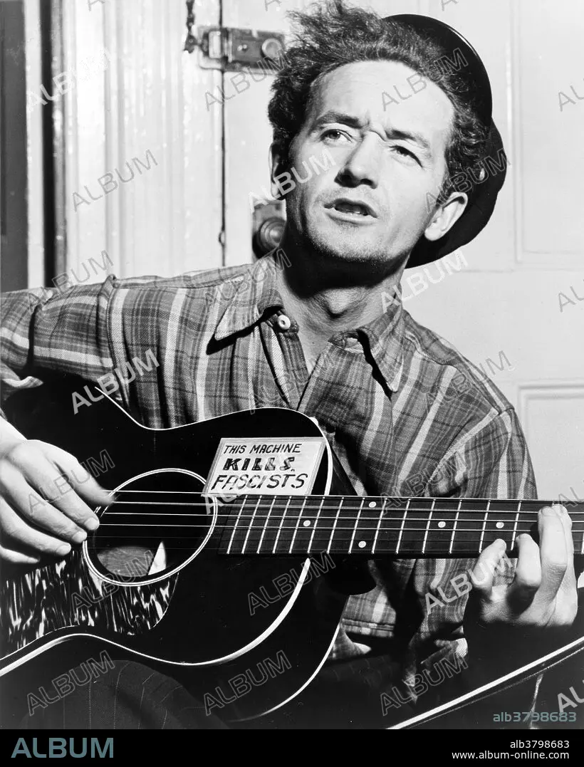 Woodrow Wilson "Woody" Guthrie (July 14, 1912 - October 3, 1967) was an American singer-songwriter and musician whose musical legacy includes hundreds of political, traditional and children's songs, ballads and improvised works. He frequently performed with the slogan This machine kills fascists displayed on his guitar. His best-known song is "This Land Is Your Land." Many of his songs are about his experiences in the Dust Bowl era during the Great Depression when Guthrie traveled with displaced farmers from Oklahoma to California and learned their traditional folk and blues songs, earning him the nickname the "Dust Bowl Troubadour." Throughout his life Guthrie was associated with United States Communist groups, though he was seemingly not a member of any. Guthrie was married three times and fathered eight children, including American folk musician Arlo Guthrie. He died in 1967, at the age of 55, from complications of Huntington's disease, a progressive genetic neurological disorder. During his later years, in spite of his illness, Guthrie served as a figurehead in the folk movement, providing inspiration to a generation of new folk musicians. Photographed by Al Aumuller for New York World Telegram & Sun, dated March 8, 1943.