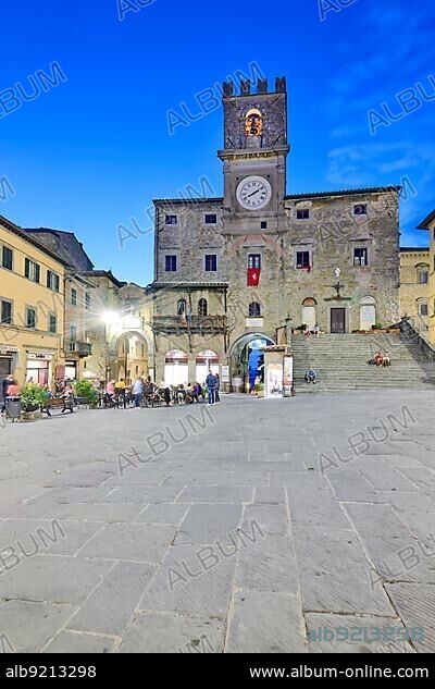 Cortona Arezzo Tuscany Italy. Palazzo del Popolo in Piazza della Repubblica at sunset