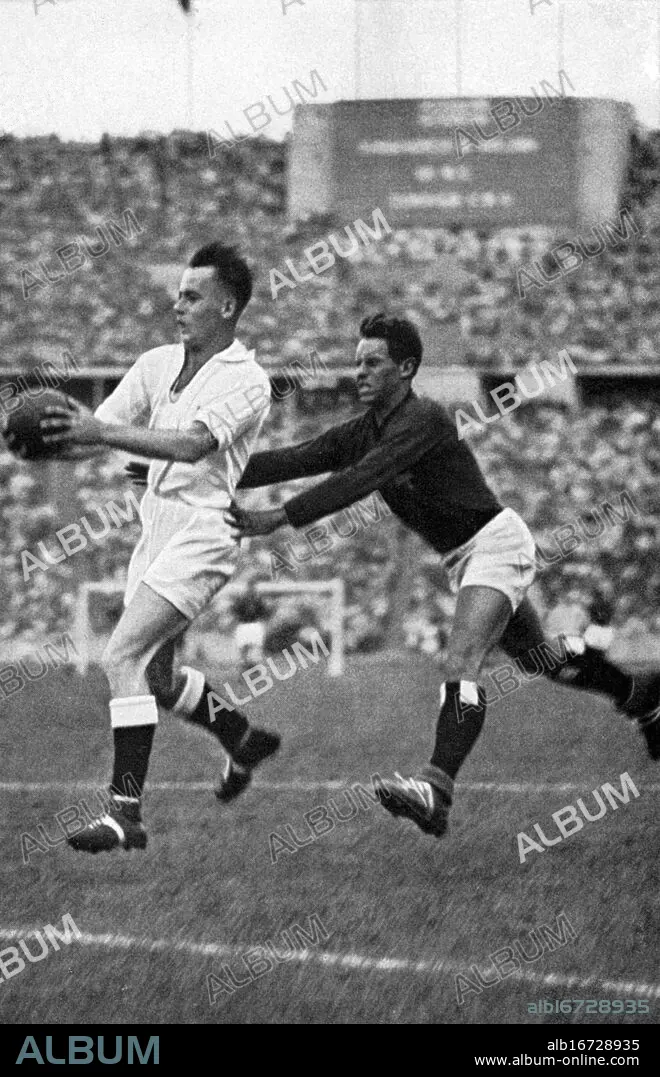 Caption: 1936 Olympics, Berlin - The handball player must catch and throw whilst running fast. (Im schnellen Lauf muss der Handballspieler fangen und werfen.). ©TopFoto