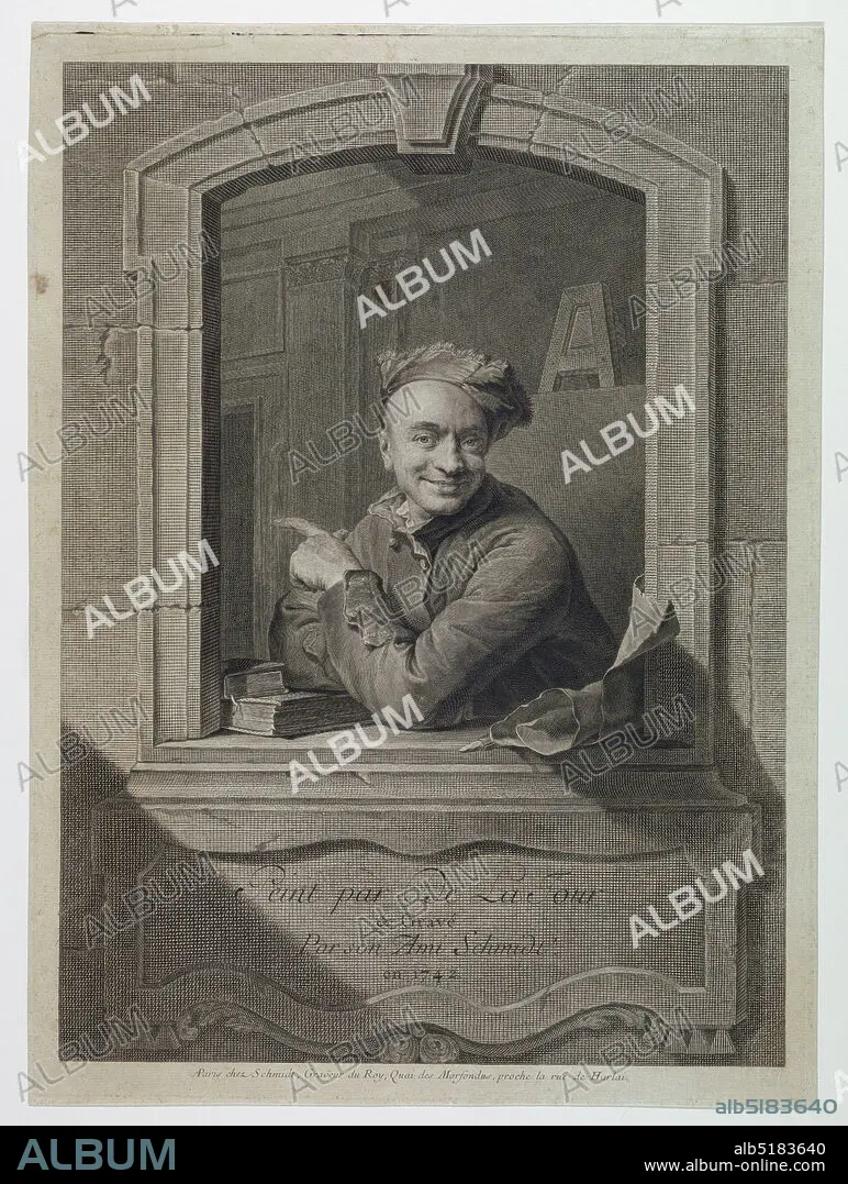 Self-Portrait of Maurice-Quentin de La Tour, Georg Friedrich Schmidt, French school, 1712 - 1775, Maurice-Quentin de La Tour, 1704 1788, Engraving on paper, Bust-length portrait of the artist, turned toward the left, looking out at the spectator. Enclosed in the architectural enframement of a window, his left arm rests on the sill, the hand pointed to the left. Inscription below, in frame: 'Peint par De La Tour/et Gravé/Par son ami Schmidt/en 1742.' Address in margin below., France, Paris, 1742, Print, Print