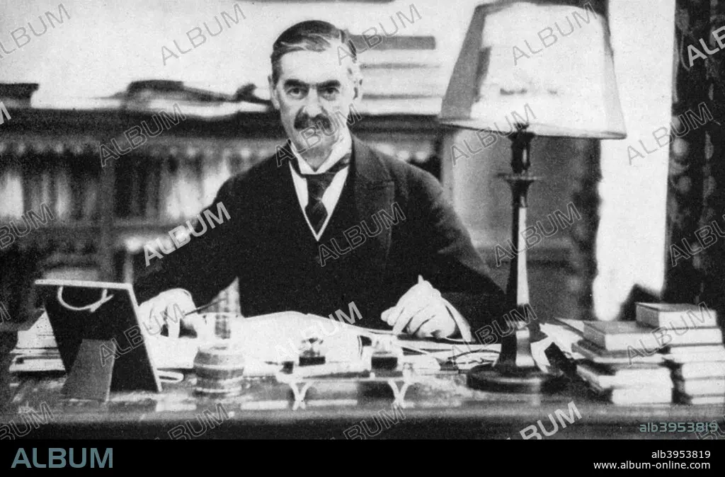Neville Chamberlain (1869-1940), British prime minister, c1930s (1936). Following his election to parliament in 1918, Chamberlain served as postmaster general (1922-23), minister of health (1923, 1924-29, and 1931), and chancellor of the Exchequer (1923-24 and 1931-37) before he succeeded Stanley Baldwin as prime minister. His policy of appeasement toward Adolf Hitler's Germany culminated in the Munich Pact of September 1938, after which Chamberlain returned home proclaiming peace for our time. Later he recognized the failure of his policy and vowed support for Poland. After Germany's invasion of that country, Chamberlain led Britain into the war against the aggressor. He was forced to resign in May 1940 and was succeeded by Sir Winston Churchill. He served in Churchill's cabinet as lord president of the council until October 1940, when illness forced his resignation. He died the following month. From His Majesty the King, 1910-1935, introduction by HW Wilson (Associated Newspapers Ltd, London, 1936).