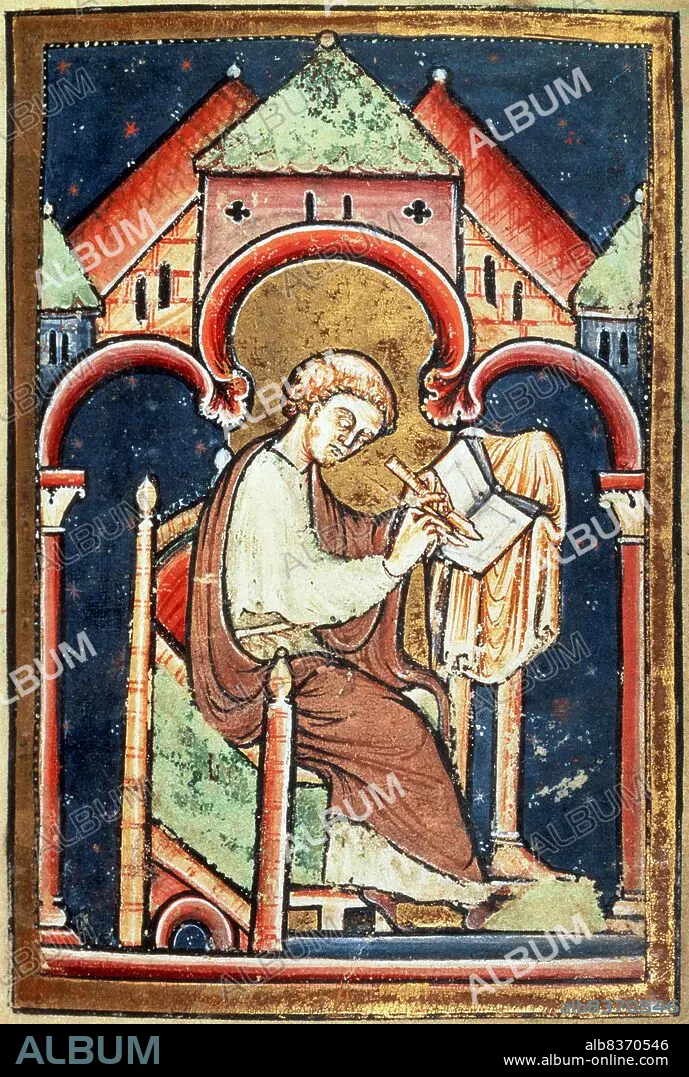 Title: England: Miniature painting of a scribe, thought to be the Venerable Bede (627-735), Prose Life of Cuthbert, late 12th Century, British Museum