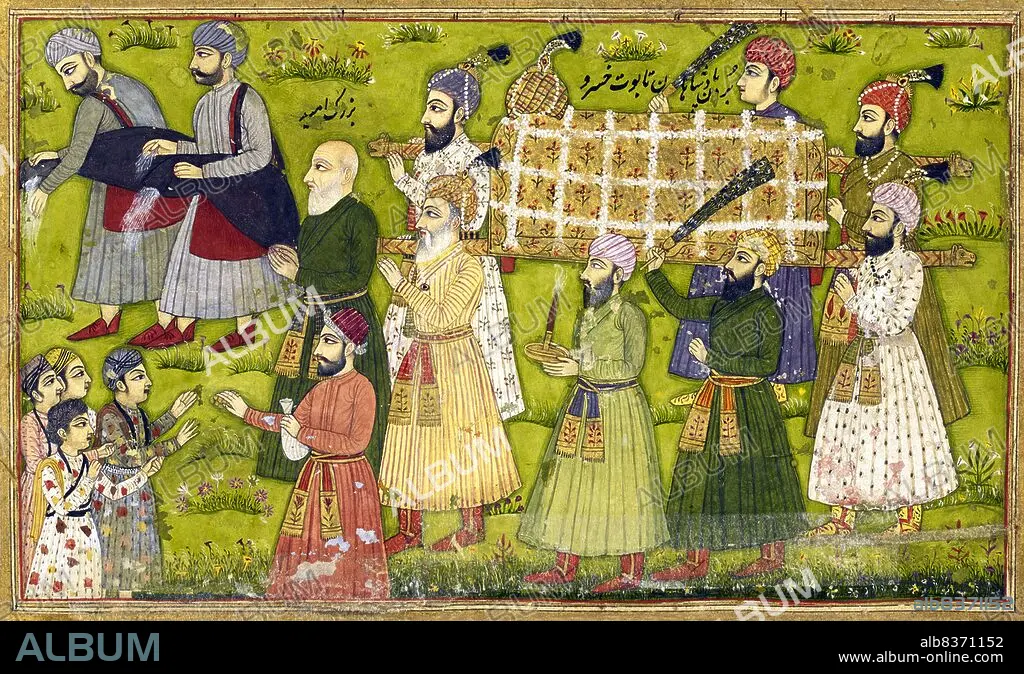 Title: Iran / India: The funeral procession of King Khosrow II led by Buzurjumid. From a version of Nizami Ganjavi's 'Khusrau u Shirin', Mughal school,1726
