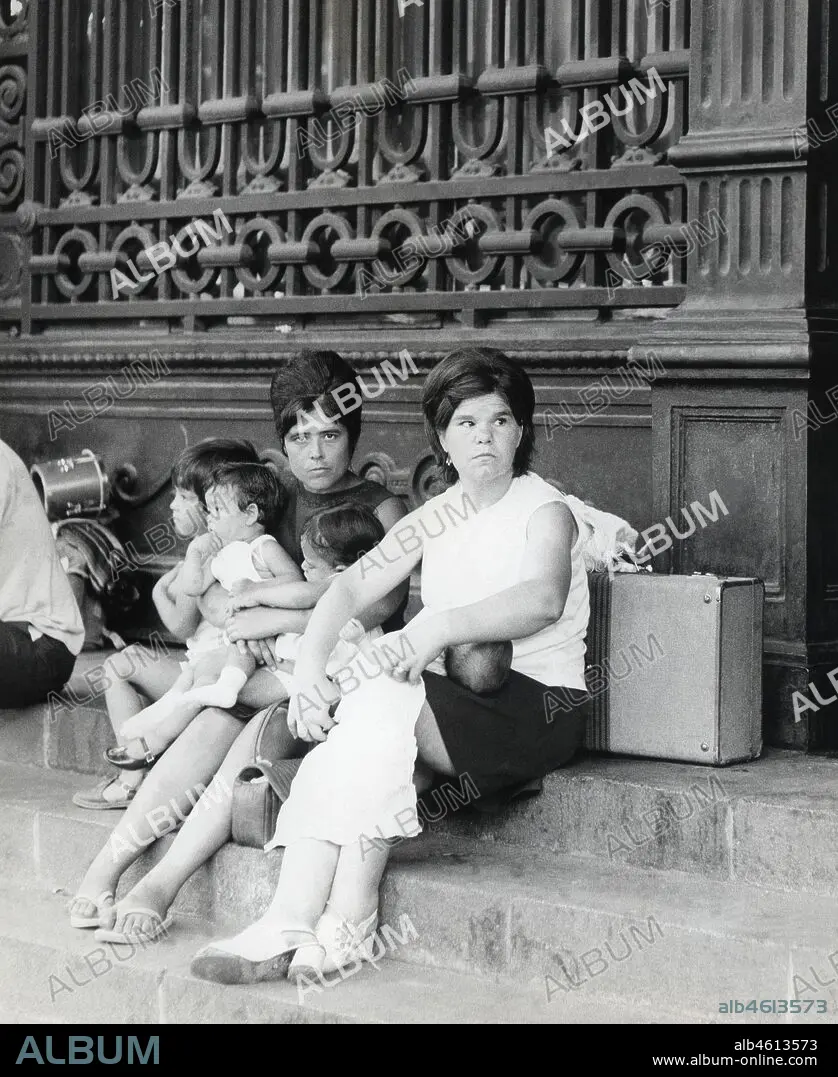 Barcelona. Estación de Francia. Emigrantes españoles esperando a la salida de la estación del tren. Años 1950.