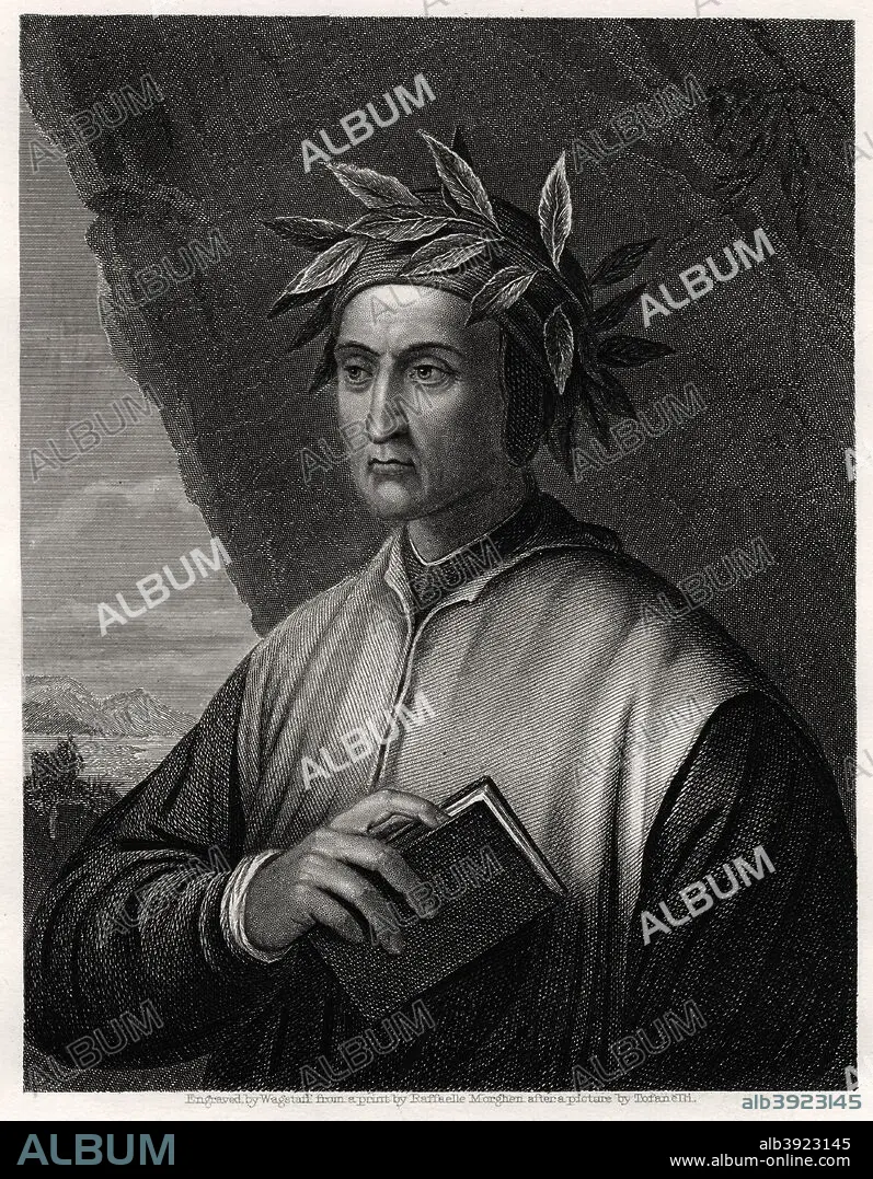 Caption: Dante Alighieri, Italian poet, 19th century. Dante (1265-1321) was the author of Divina Commedia (Divine Comedy), the great Italian epic poem which tells the story of Dante's journey through hell, purgatory and heaven, the three realms of the dead.