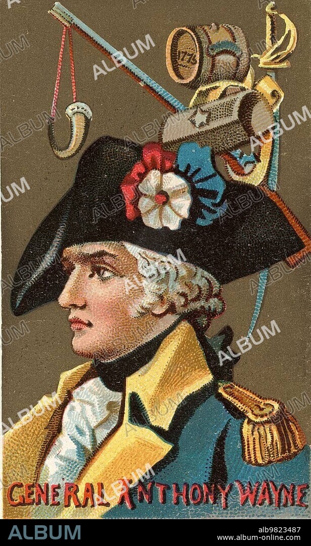 Famous Persons in American History; Anthony Wayne (born1 January 1745 in Easttown Township) (Chester County) (Province of Pennsylvania) (died15 December 1796 in Erie) (Pennsylvania); nicknamed Mad Anthony (Crazy Anthony); was a U.S. general and politician; Historical; digital reproduction of a 19th-century scrapbook picture.