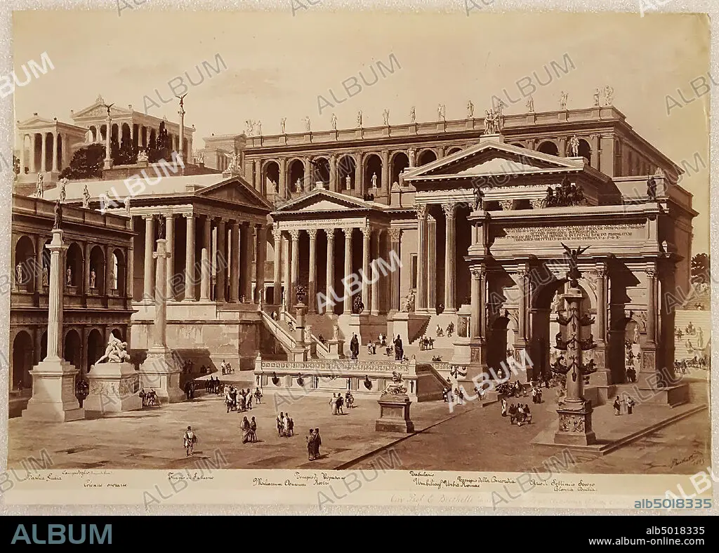 Caption: Perspective study of the Roman Forum in Rome, made by E. Becchetti, photo, paper, albumine print, 37.8 x 26.8 cm, 1893, Italy